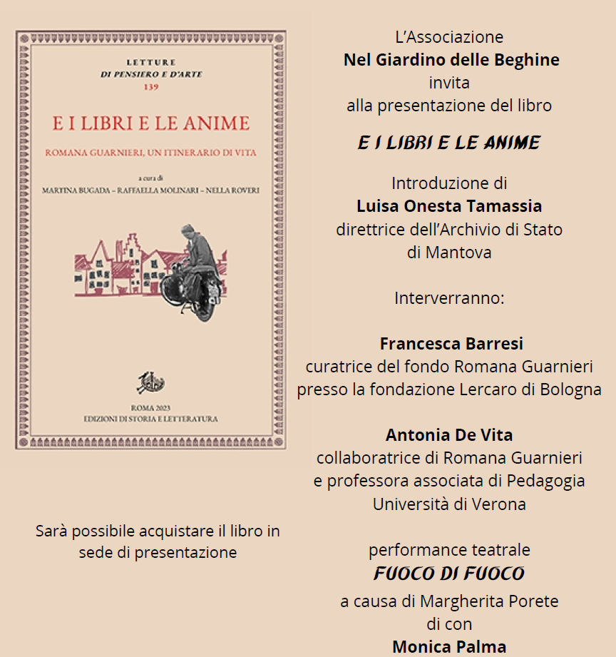 La nostra Associazione invita per sabato 9 marzo alle ore 16.00 a Mantova, presso l'Archivio di Stato di Mantova, nella Sagrestia della SS.Trinità, in via Dottrina Cristina 4 alla presentazione del libro "E i libri e le anime". La Diorettrice stessa Luisa Onesta Tamassia introdurrà l'incontro; interverranno Francesca Barresi, curatrice del fondo Romana Guarnieri presso la Fondazione Lercaro di Bologna e Antonia De Vita collaboratrice di Ropmana Guarnieri e professoressa associata di Pedagogia Università di Verona.